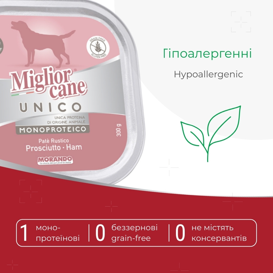 Влажный корм для собак Migliorcane UNICO с прошутто от итальянского производителя Morando — это беззерновой монопротеиновый корм супер-премиум класса для собак средних пород. Рацион сочетает натуральный состав, высокое качество ингредиентов и современные подходы к питанию собак.