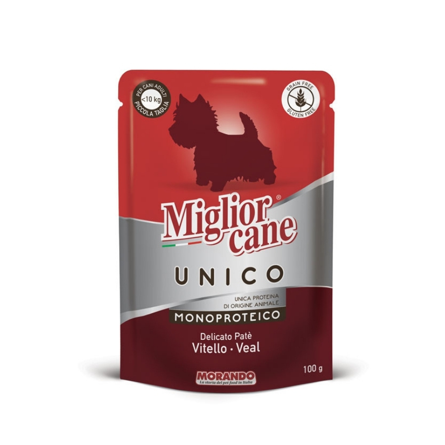 Morando Migliorcane UNICO паштет из телятины — это беззерновой монопротеиновый корм супер-премиум класса для собак мелких и средних пород. Линейка Migliorcane UNICO является флагманской и самой современной серией кормов итальянского производителя Morando, в которой сосредоточены беззерновые и монопротеиновые рецептуры с повышенными требованиями к качеству ингредиентов. Рацион сочетает натуральный состав и современные подходы к питанию собак и производится с соблюдением стандартов контроля качества ЕС, без использования искусственных красителей и консервантов.